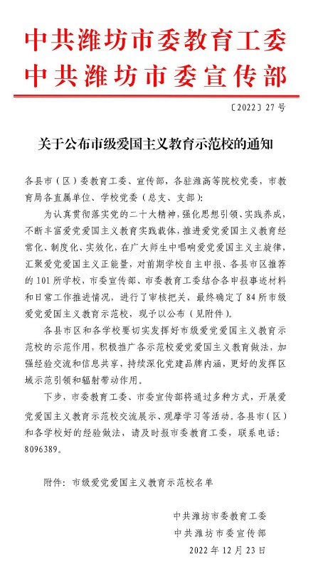 弘扬爱国精神,传承强国之志。近日,潍坊市委宣传部、潍坊市委教育工委联合发布了《关于公布市级爱国主义教育示范校的通知》,经层层筛选,我校荣获“潍坊市爱党爱国主义教育示范校”荣誉称号。
