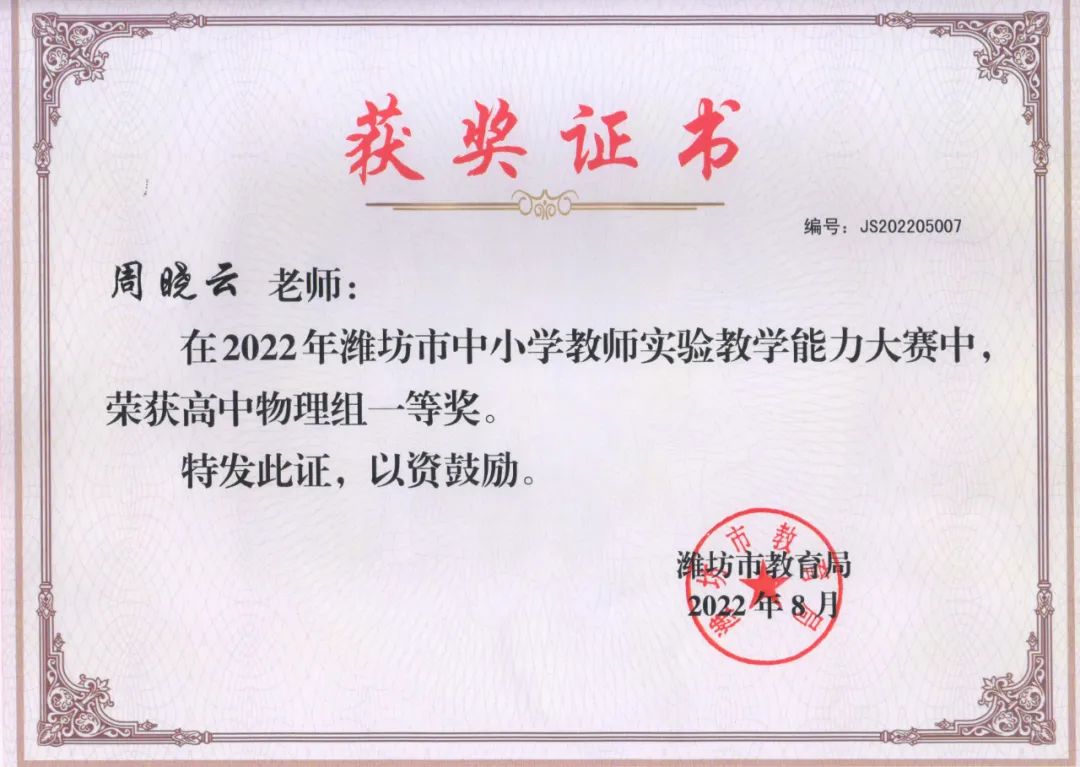由山东省教育厅主办、山东省教育发展服务中心承办、潍坊市教育局协办的山东省第一届中小学教师实验教学能力大赛,共有来自16个市的399位老师进入决赛。凭借扎实的教学功底,我校物理教师周晓云喜提潍坊市一等奖。