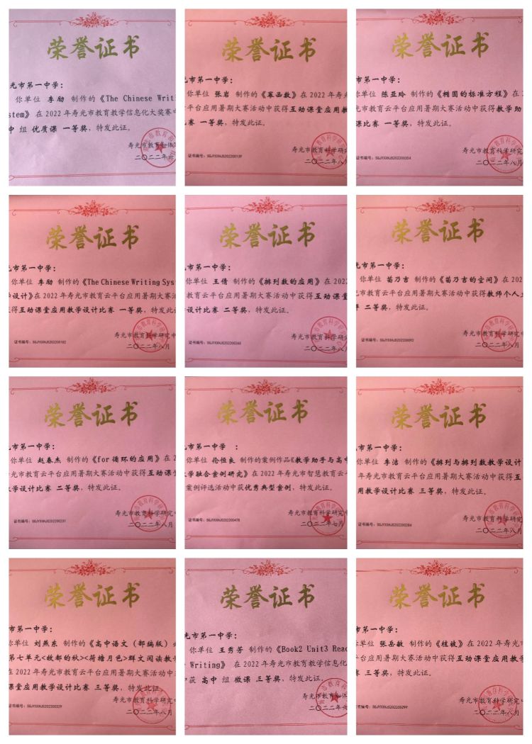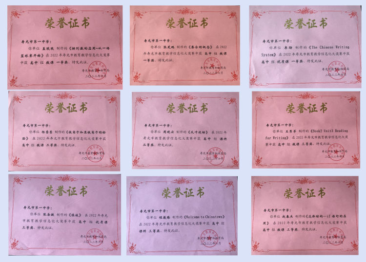 在2022年寿光市教育教学信息化大奖赛中,李励、张芝鹏老师荣获优质课一等奖,张岳敏、周晓云老师荣获三等奖;李励、周晓云老师还荣获课件二等奖,程薇臻老师荣获课件三等奖;张芝鹏、盖琰琰老师荣获微课一等奖,杨莹莹老师荣获微课二等奖,李励、王秀芳、赵春杰荣获微课三等奖。