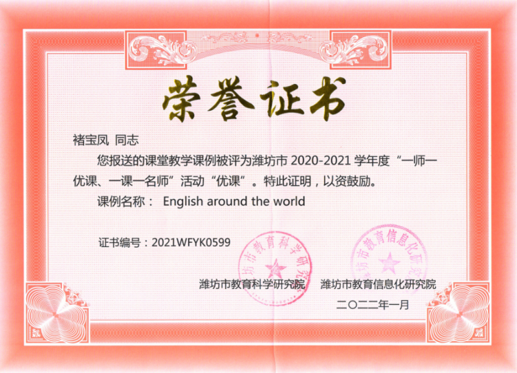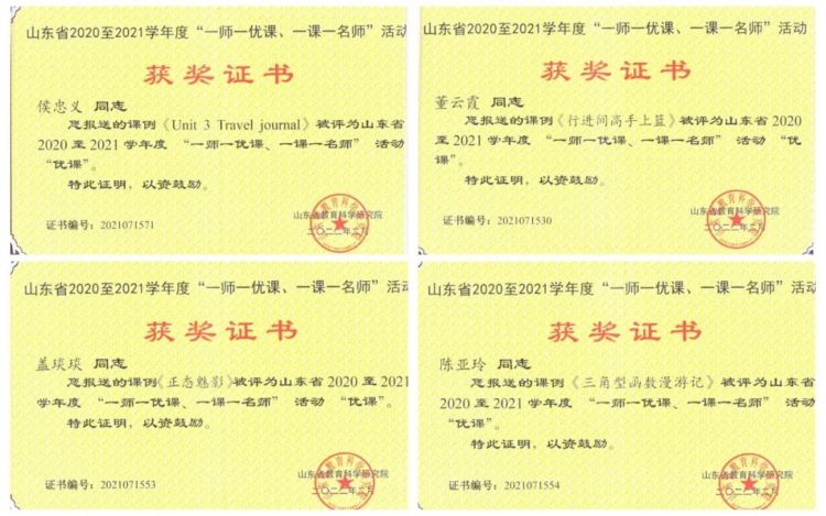 在山东省2021至2022学年度“一师一优课、一课一名师”活动评选活动中,我校侯忠义、董云霞、盖琰琰、陈亚玲四位老师获得省级优课荣誉,获奖课例将供全省教师远程研修时观摩学习使用。另外,侯忠义、董云霞、盖琰琰、陈亚玲及褚宝凤五位老师的课例被评为潍坊市2021—2022学年度“一师一优课、一课一名师”活动“优课”。