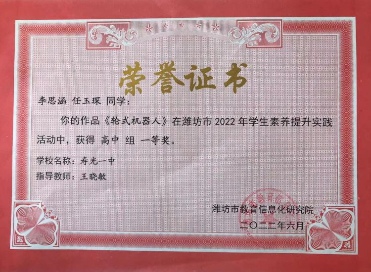 在2021—2022学年“全国中小学信息技术创新与实践”决赛中,胡国英老师辅导的李怡璇、张劭恒同学获智能园艺家高中组二等奖;王晓敏老师辅导的李思涵、任玉琛同学获轮式机器人高中组交流奖。以上四名同学的作品同时获得潍坊市2022年学生素养提升实践活动高中组一等奖。