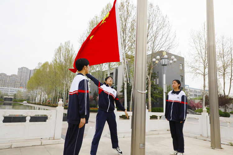 伴随着雄伟庄严的国歌,五星红旗冉冉升起,全体师生庄严肃立,怀着对先烈的崇高敬意,面向国旗行注目礼。