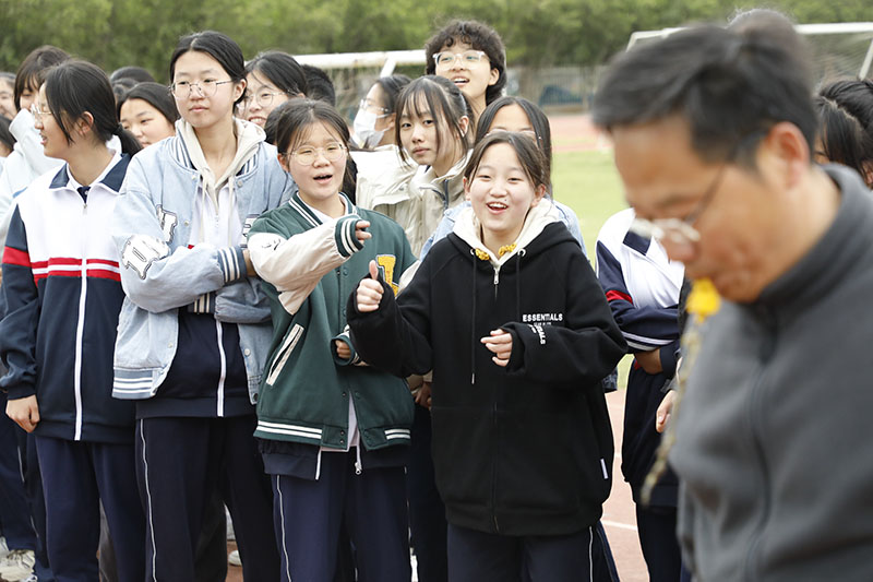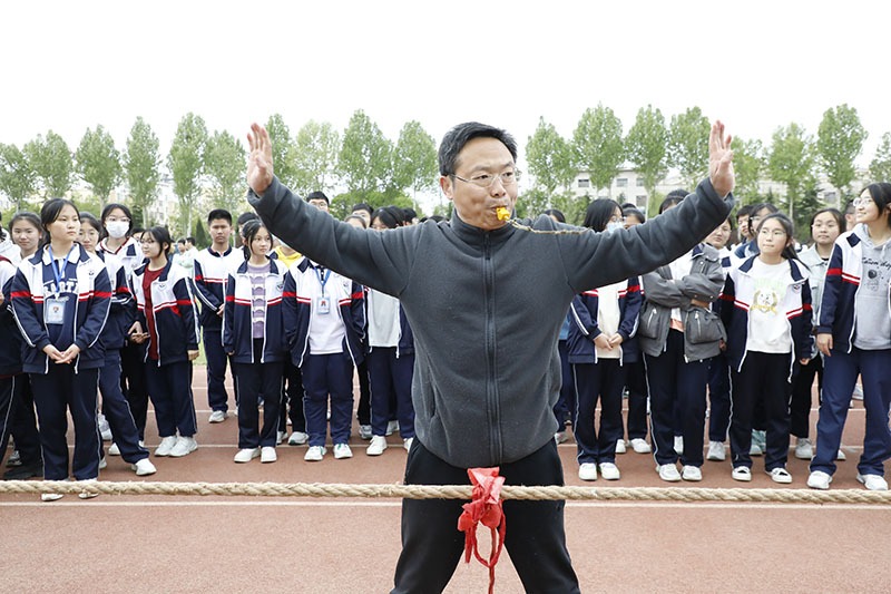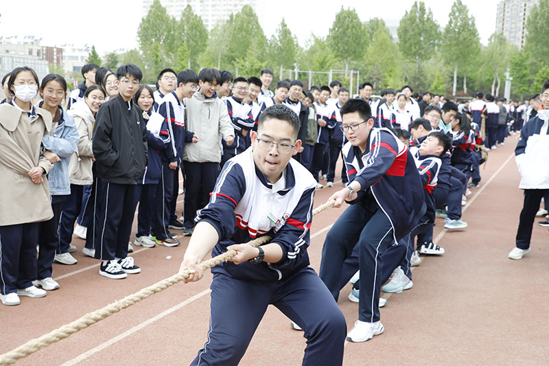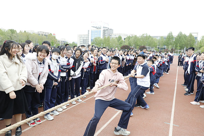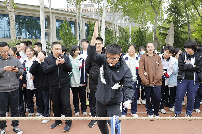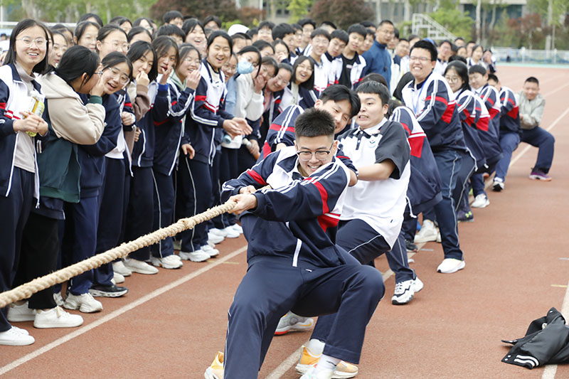 比赛中,同学们紧握麻绳,扎稳脚步,劲往一处使;其他同学在旁边高声呐喊,加油助威,口号整齐有力。赢了比赛的同学欢呼跳跃,输了比赛的同学也没有丝毫气馁,或者积蓄力量准备下一场比赛,或者来到助威的队伍里为其他班级鼓舞士气。比赛现场热火朝天,加油声、呐喊声瞬间温暖了整个校园。