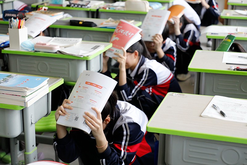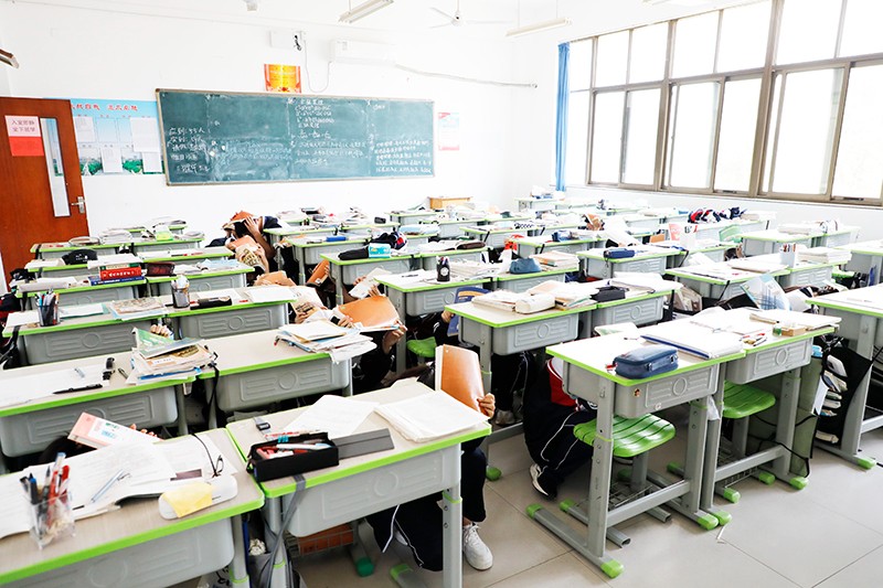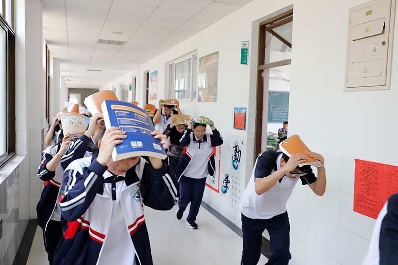 上午9时50分,一阵急促的警报铃声响起,正值上课时间,同学们顿时绷紧神经,意识到地震灾害发生。此时,快速反应过来的任课教师立即指挥同学们按照之前学习的逃生知识,紧急避险、有序撤离。“都俯下身体,头低于桌面,或躲在墙角,身体尽量倦曲成团,用书本或书包盖头……”洪亮而镇定的声音,给同学们打了一针安心剂。