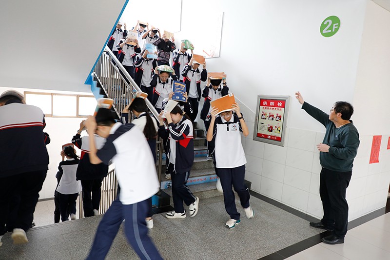 随后,老师们快速打开前门,并安排后排靠门的同学快速打开后门,接着前四排从前门,后四排从后门,同学们弯腰快速撤出教室。撤离过程中,根据前期部署,各个教学楼一层、二层学生在“主震”过后开始向外疏散,三、四、五层学生在听到第二次警笛信号后在老师指挥下有序疏散。每个楼梯口,都设有专门教师指挥看护学生,以确保学生下楼秩序有条不紊,防止踩踏事件发生。最先跑出教学楼的几名学生分别扶住楼门,以确保逃生之路安全畅通。与此同时,学校防灾救灾指挥部的相关领导、工作人员,迅速赶到教学楼前指挥调度,学校医务人员也快速赶至,随时待命。