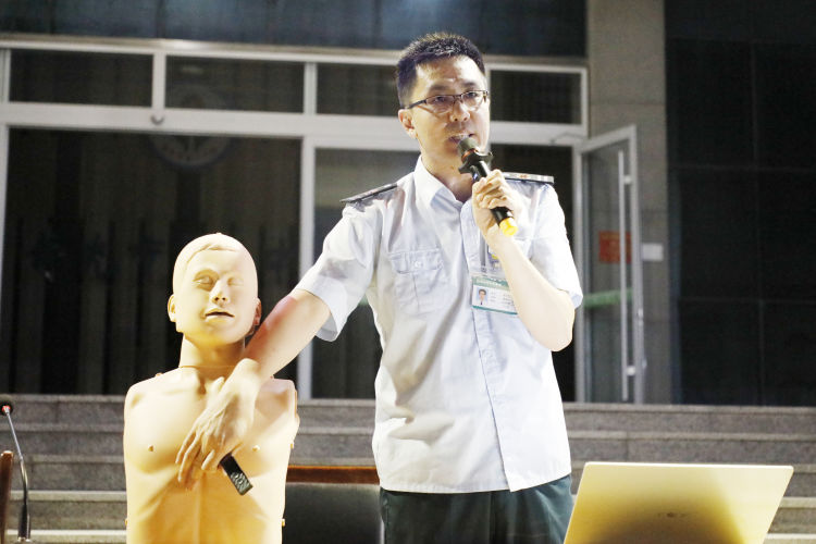 张万恒医师通过实际案例为大家讲解了现场救护“黄金4分钟”的重要性,重点强调心肺复苏中如何判断呼吸、调整体位、打开气道、胸外按压及人工呼吸的关键操作要领。同时还讲解了海姆立克急救法的的原理、急救手法、自救手法等内容。