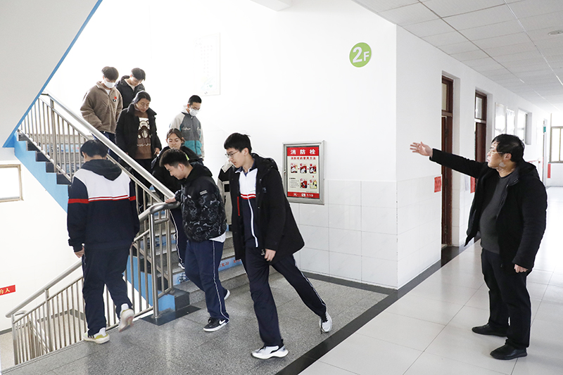 演练前,学校召开调度会对演练各个环节进行了周密安排和部署。9点50分,警报响起,任课教师立即指挥学生紧急疏散,教师打开前门,同时命令后排靠门的同学打开后门,然后指挥学生按指定路线进行有序疏散。各班疏散到集合地点后,班主任清查班级人数并向级部主任汇总。演练中,学生们还模拟了在疏散时发生了意外及正确的处置方法。