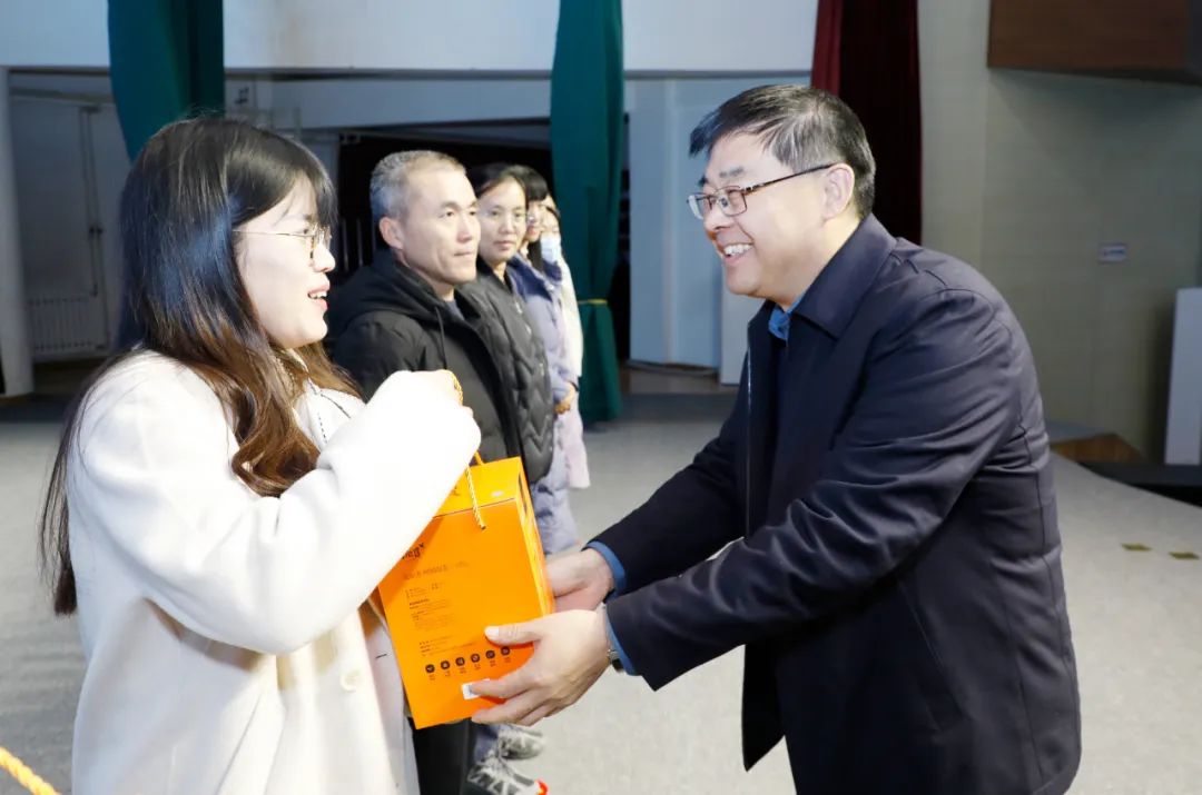 热烈掌声响起,学校党委书记、校长肖学军代表学校为获奖班主任家属颁发奖品,以表支持与感谢。