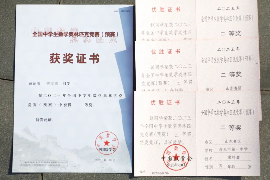 在全国中学生数学奥林匹克竞赛(预赛)中,2021级42班学生曹文涛发挥出色,脱颖而出,荣获一等奖,成为全市唯一一名获此奖项的学生。此外,2021级42班学生隋雪松、43班学生国翔琪和2022级44班学生桑梓鑫以优异的成绩摘得山东赛区二等奖。