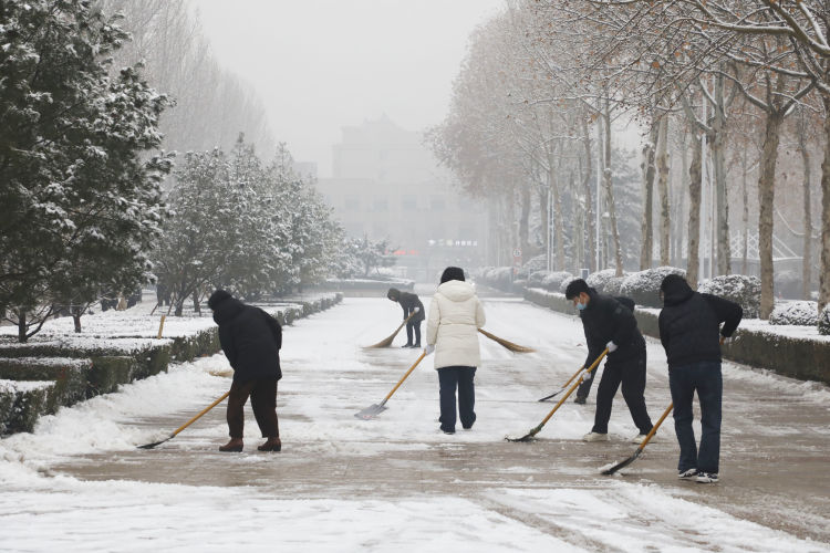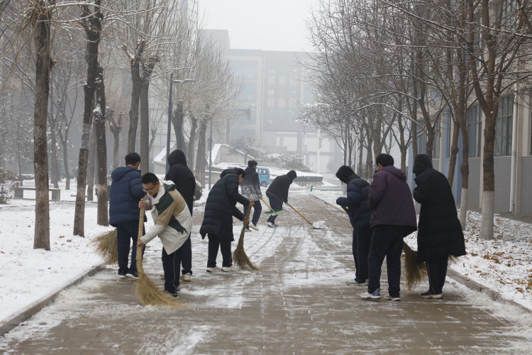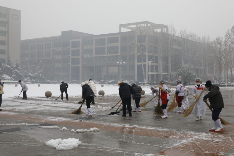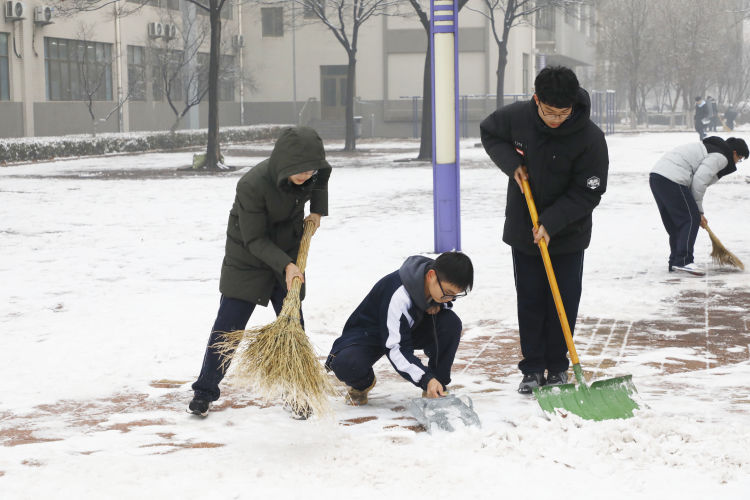 最美是雪景,更是雪中忙碌的身影。虽然寒风凛冽,寒气逼人,但依旧挡不住师生们的热情和干劲,他们手持冰铲、铁锹、扫帚等除雪工具,齐心协力,默契配合,全力清除了校园内的积雪和暗冰,为全校师生扫出一条条“暖心通道”。