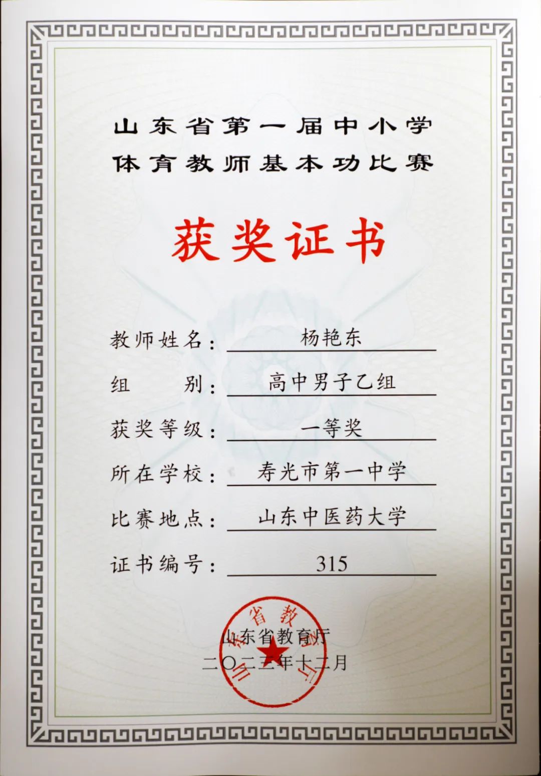 近日,山东省第一届中小学体育教师基本功比赛获奖名单公布,经过层层选拔、激烈角逐,来自寿光市第一中学的杨艳东老师,凭借扎实的教学功底、深厚的学科素养和出色的赛场表现获得全省高中男子乙组一等奖,寿光市第一中学以不断追求卓越的精神风貌摘得“体育道德风尚奖先进单位”荣誉。