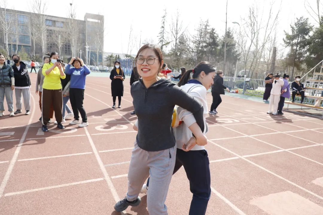 “乐” 运动,“悦”生活。同步进行的教职工趣味运动会,为这场运动盛会带来非同寻常的欢乐。趣味运动会由来自高中各级部,后勤处室的17支代表队参加,比赛有集体8字跳绳、踢毽子、沙包投准、篮球接力、定点投篮、背对背搬运接力等项目。每个比赛项目既是个人力量的角逐,又是团队智慧的比拼。平时善于教学和管理的老师们,赛场上也善于用幽默和创意来“取胜”。