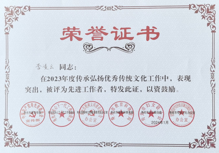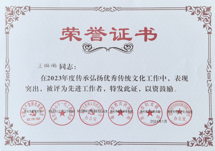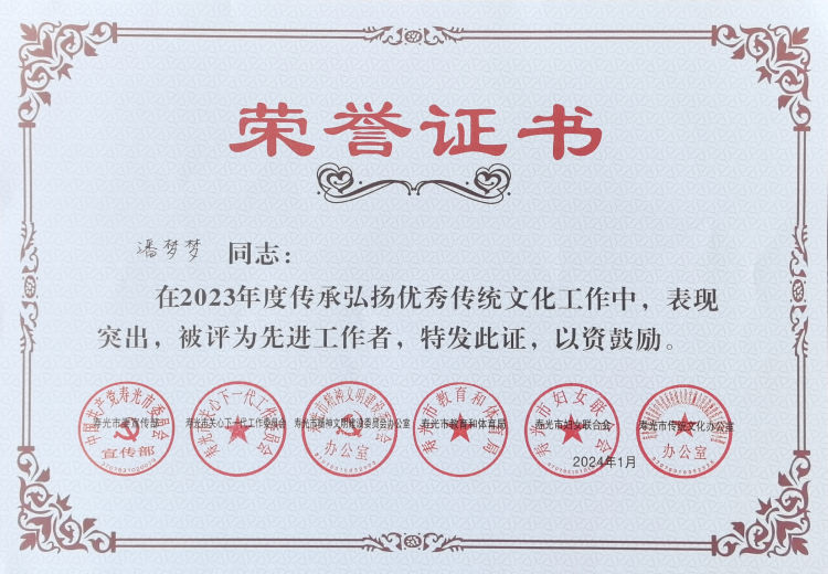 近日,在寿光市委宣传部、寿光市关心下一代工作委员会、寿光市精神文明建设委员会办公室、寿光市教体局、寿光市妇女联合会、寿光市传统文化办公室等六部门联合公布的表扬名单中,寿光一中元君玲、潘梦梦、王璐璐、李凌云四名教师在2023年度传承弘扬优秀传统文化工作中,表现突出,被授予“先进工作者”称号。