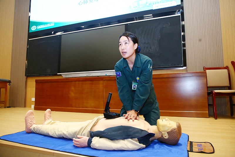 张万恒医师通过实际案例为大家讲解了现场救护“黄金4分钟”的重要性,重点强调心肺复苏中如何判断呼吸、调整体位、打开气道、胸外按压及人工呼吸的关键操作要领。同时还讲解了海姆立克急救法的的原理、急救手法、自救手法等内容。