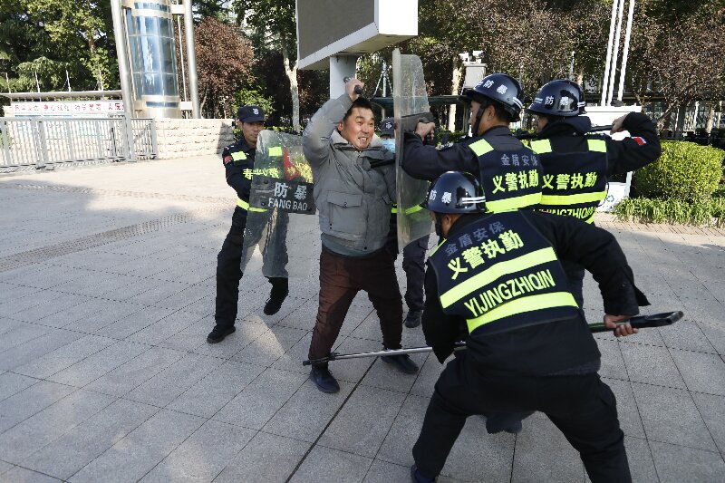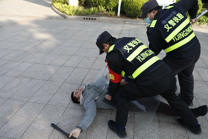 面对突发情况,学校保安人员在第一时间汇报学校并通过“一键报警”拨打报警电话,同时手持盾牌、钢叉和长棍的保安队队员们立即对“歹徒”进行强制围堵,迅速启动“二对一”“三对一”“五对一”战术,经过激烈搏斗,最终将“歹徒”合力制服,避免了事态进一步恶化及造成不良后果。